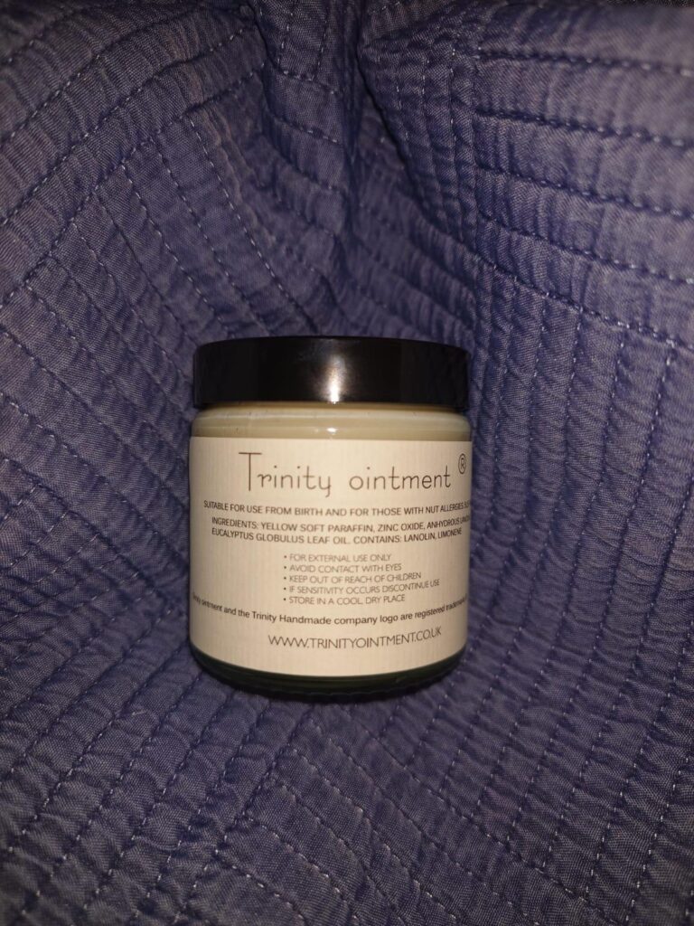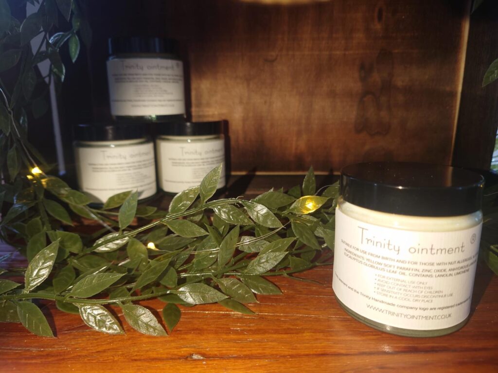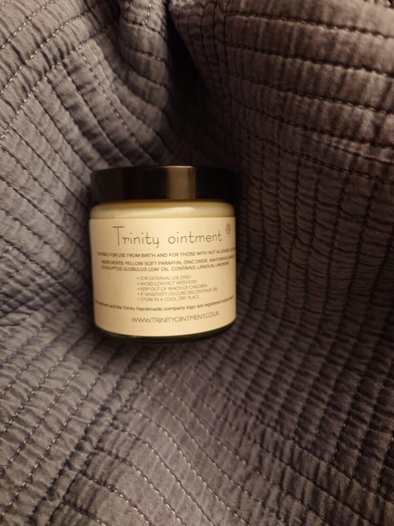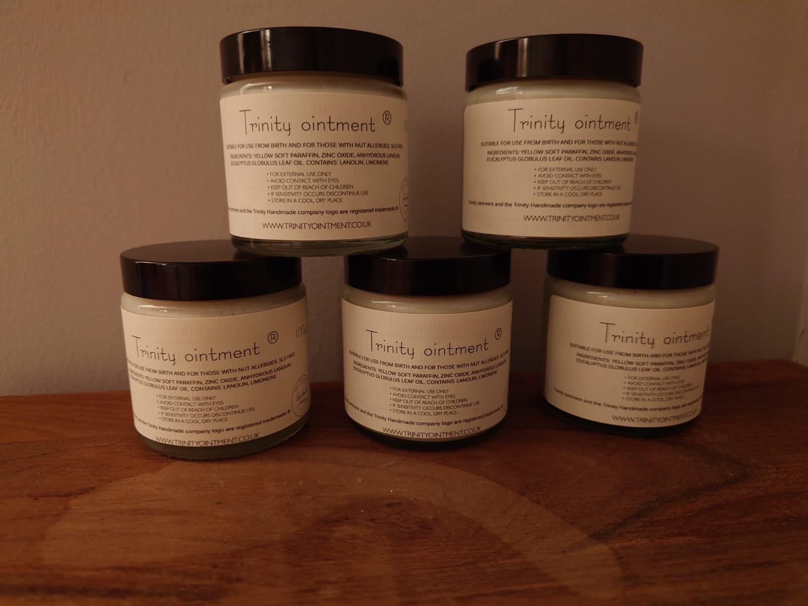 Trinity Ointment® is a handmade product, made in Hawick, by a pharmacist. It is a baby bum ointment and eczema preparation. Trinity Ointment® is suitable to use from birth and for people with nut allergies. It is also SLS free and free from parabens. Trinity Ointment® can be applied as often as required.